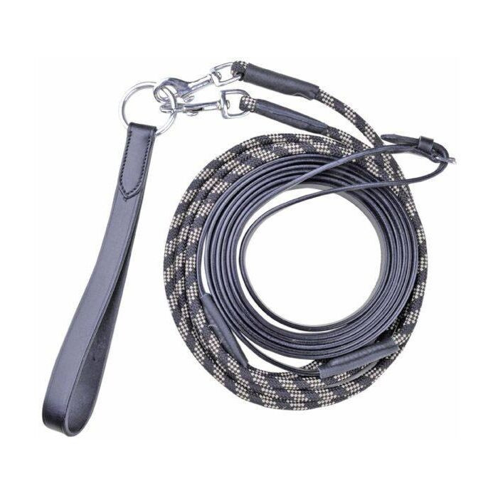 Kombinált segédszár bőrből és zsinóros betéttel, karabinerral az egyik végén, ezüst színű szerelvényekkel.