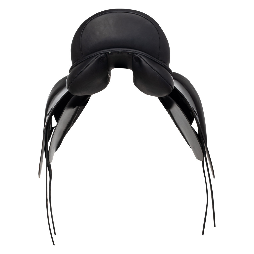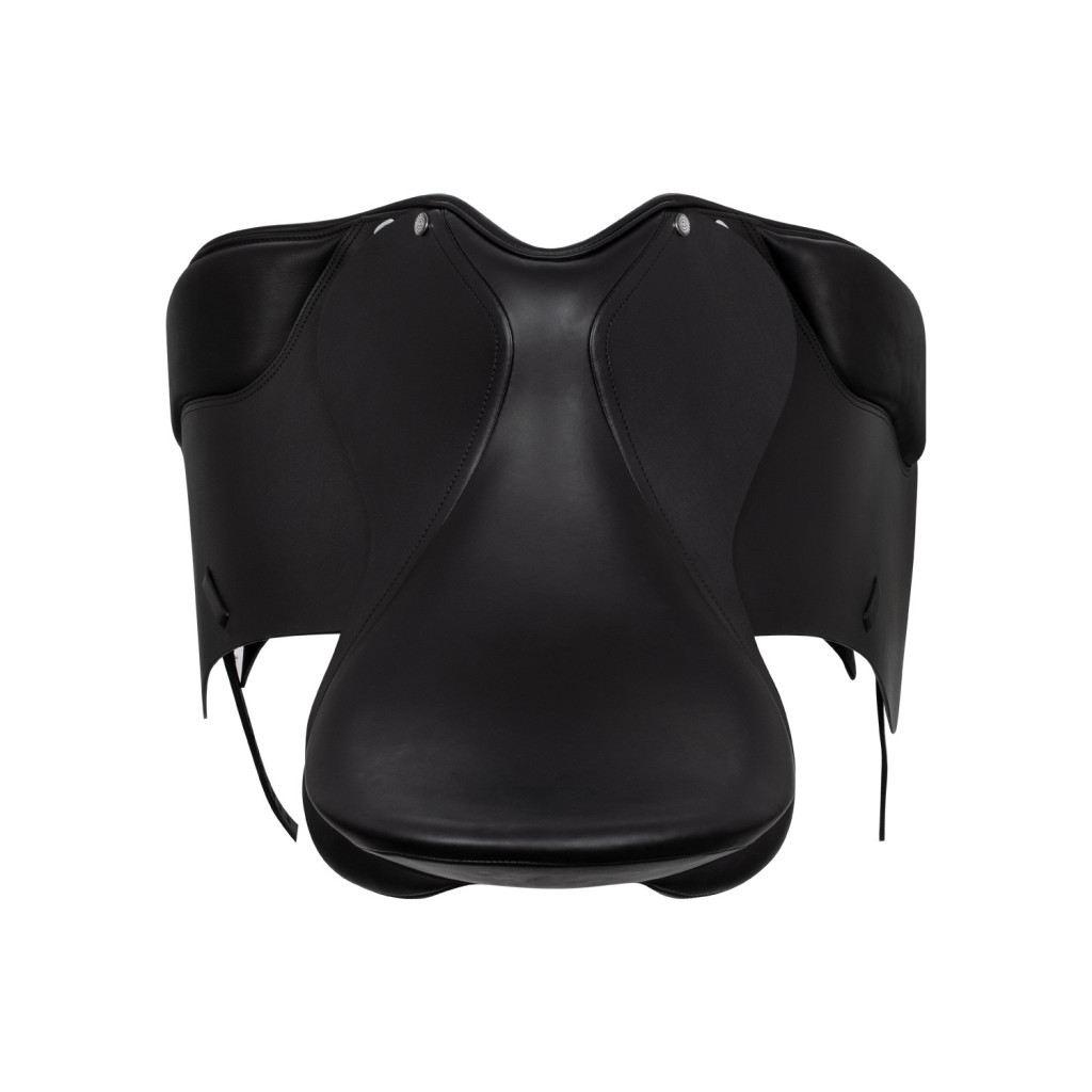 Kiváló minőségű bőrből készült díjlovagló nyereg kivehető blokkokkal , amelyek lehetővé teszik a lovas számára a legjobb pozíció kiválasztását.