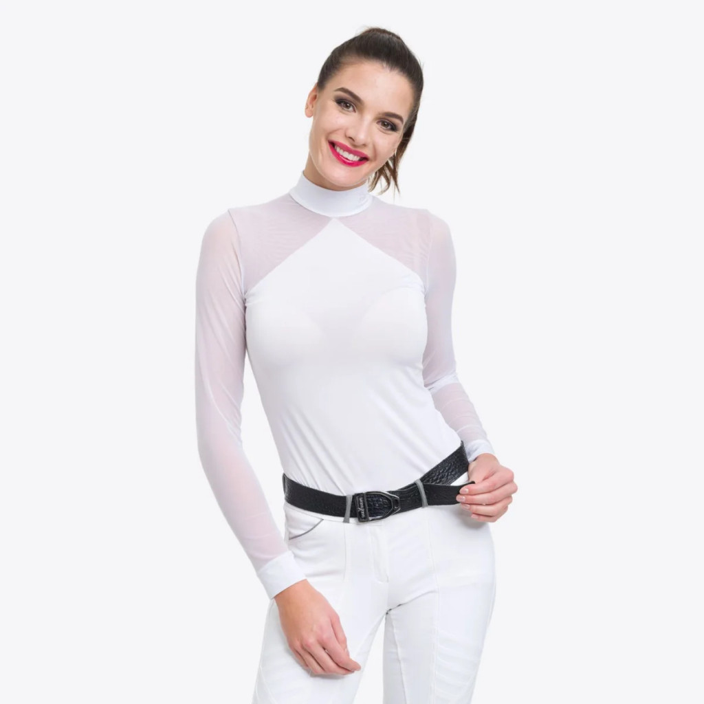 Teljesen új dizájn lovas hölgyek számára: absztrakt és karcsúsító formatervezés, a nőies vonalakés kifinomult stílus hangsúlyozása érdekében. Ez a gyönyörű, second-skin necc versenying fehér lovaglónadrággal viselve minden elegáns és nőis lovas számámára must-have darab a következő szezonra. Csakúgy, mint minden termékünk - minőségi kivitelezésben készült. Rövid és hosszú ujjú változatban kapható.