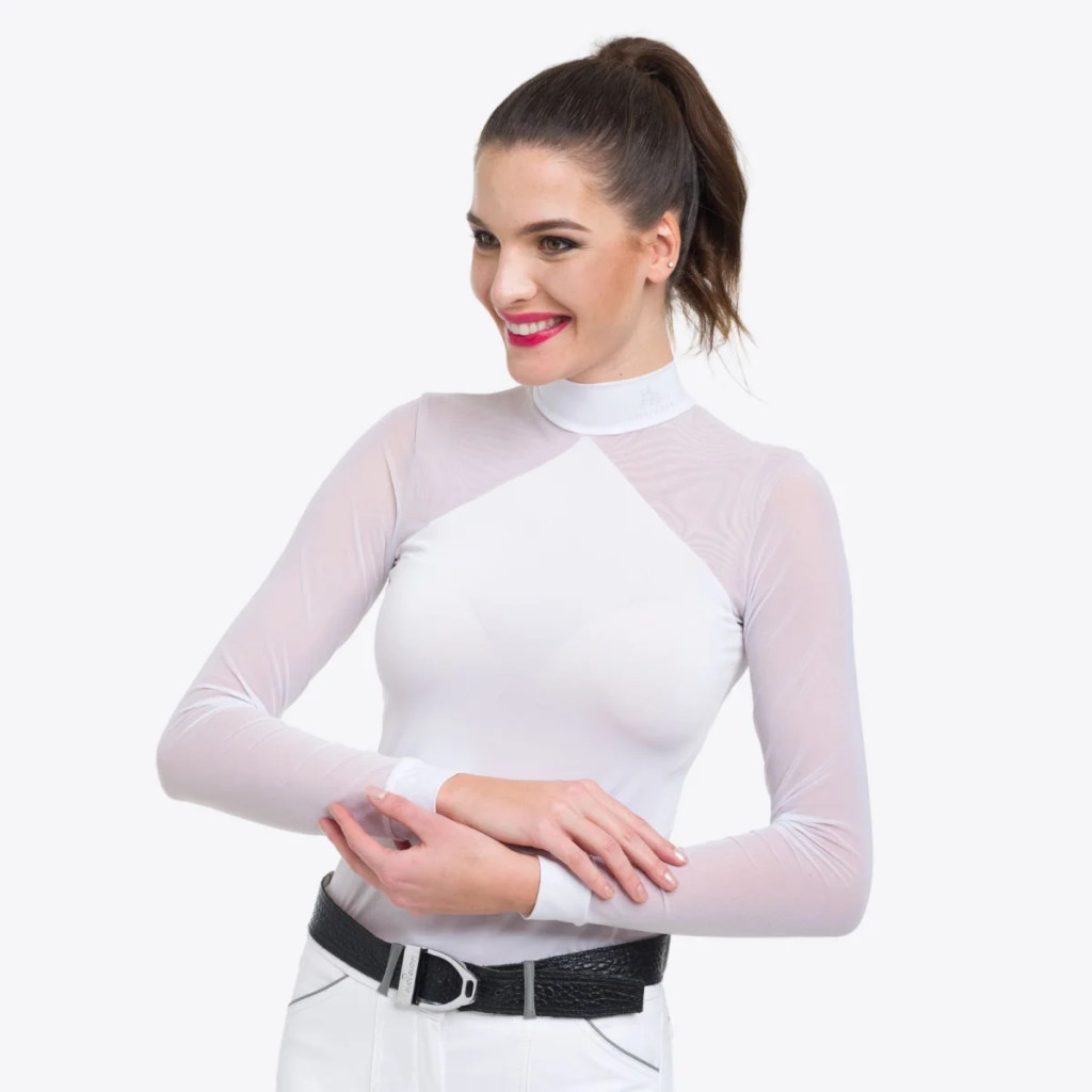 Teljesen új dizájn lovas hölgyek számára: absztrakt és karcsúsító formatervezés, a nőies vonalakés kifinomult stílus hangsúlyozása érdekében. Ez a gyönyörű, second-skin necc versenying fehér lovaglónadrággal viselve minden elegáns és nőis lovas számámára must-have darab a következő szezonra. Csakúgy, mint minden termékünk - minőségi kivitelezésben készült. Rövid és hosszú ujjú változatban kapható.