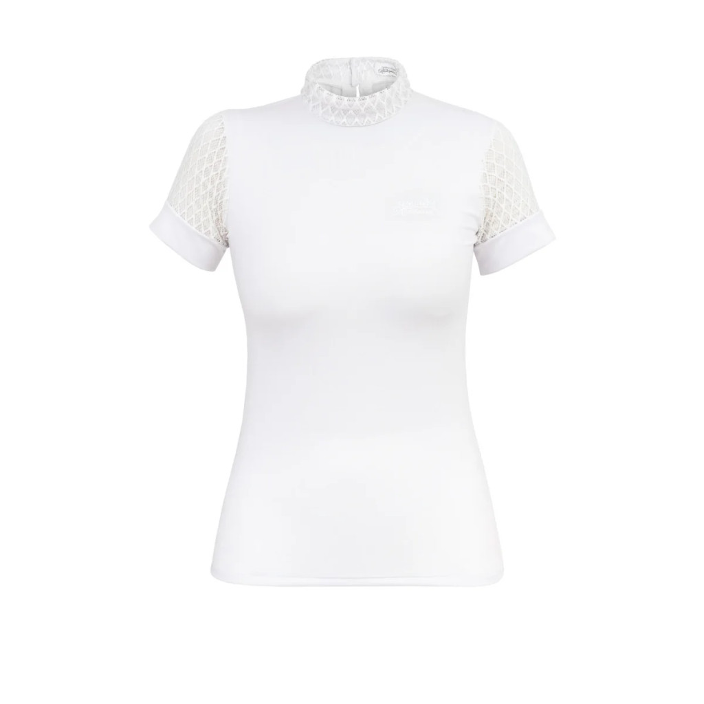 A tervezők egy olyan női versenyinget álmodtak meg, ami sportos is, mégis csipkés! Elég volt az unalmas egyszerű, sima fehér álló nyakból, emeljük ki érdekes rombusz alakú csipkével a gallért, legyen éke a megjelenésünknek. Ez a versenying különösen szép, versenyzakó alatt viselve, köszönhetően az érdekes nyak megoldásnak, amikor pedig lekerül a zakó, minden szem a lovardában a gyönyörű rombusz alakú csipke ujjakra szegeződik majd. Kényelmes és funkcionális, technikai alapanyagokból elkészített remekmű. (Mosásnál kérjük figyeljen a finom csipke/mesh részletek miatt, javasoljuk mosó hálóban, könnyű programmal vagy kézzel mosni.)