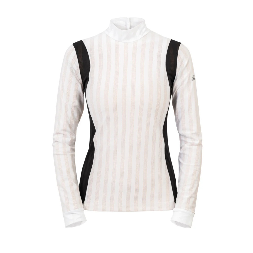 Ennél a különleges versenyingnél a tervezők nem csak a különböző anyagok összeillesztésével emelik ki a nőies idomokat, hanem segítségül hívják a színeket is hozzá. A kontrasztos színek az alakot még inkább karcsúsítják, mégis egyben sportos megjelenést kölcsönöznek viselőjének. A tervezők egy kifejezetten előnyös, rugalmas és lágy technikai anyagot használnak fehér és fekete színben, mely lyukacsos és csíkos, kifejezetten szép kelme. Az átlátszóság elkerülése érdekében testszínű lycra anyaggal bélelt. A versenying különlegessége, hogy a lyukacsos csíkos anyag az álló nyakon és mandzsettákon is megjelenik. (Mosásnál kérjük figyeljen a finom mesh részletek miatt, javasoljuk a terméket mosó hálóban, könnyű programmal mosni és a kontrasztos színek miatt az első mosásnál feltétlenül használjon színfogó kendőt!)