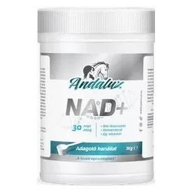 Andaluz NAD+ por 1kg Sejtszintű energia és védelem lovaknakAz Andaluz NAD+ por 1kg egy prémium minőségű táplálékkiegészítő, amely a lovak sejtszintű energiatermelését és regenerációját támogatja. A benne található nikotinamid-ribozid (NR) a B3-vitamin egy formája, amely kulcsszerepet játszik a sejtek energiatermelésében. Ezen kívül kvercetin és resveratrol is található benne, amelyek hozzájárulnak az immunrendszer normál működéséhez és a szervezet általános jólétéhez.Főbb jellemzők:Összetétel: Nikotinamid-ribozid (NR), kvercetin, resveratrolFelhasználás: Takarmányhoz keverveAdagolás: Nagytestű ló (500 kg): 3 adagolókanál (30 g) napontaTárolás: Hűvös, száraz, napfénytől védett helyen