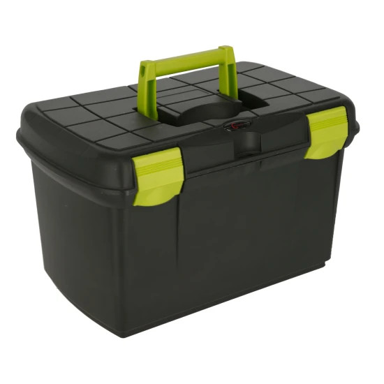 Praktikus, strapabíró műanyag doboz lovas ápolószerek és eszközök rendszerezett tárolásához. A belső kivehető betéttálca segíti a kisebb kiegészítők elhelyezését, míg a nagyméretű alsó rekesz alkalmas kefék, spray-k és egyéb ápolóeszközök tárolására. A doboz fedele két biztonsági zárral rögzíthető.