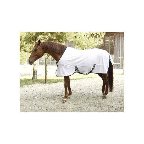 A KERBL RugBe SuperFly légytakaró egy könnyű, légáteresztő és strapabíró takaró, amely ideális választás legelőn és karámban tartott lovak számára. A sűrűn szőtt, puha poliészter anyag hatékony védelmet nyújt a legyek, vérszívó és csípő rovarok ellen. A világos szín és a fényes, légáteresztő anyag segít megelőzni a túlmelegedést. A levehető nyakrész tépőzárral rögzíthető, a levehető, rugalmas lábzsinórok pedig megakadályozzák a takaró elcsúszását. A nagy farvédő és a mellrész alábélelt kialakítása biztosítja a ló kényelmét és védelmét. A takaró 30 °C-on géppel mosható.